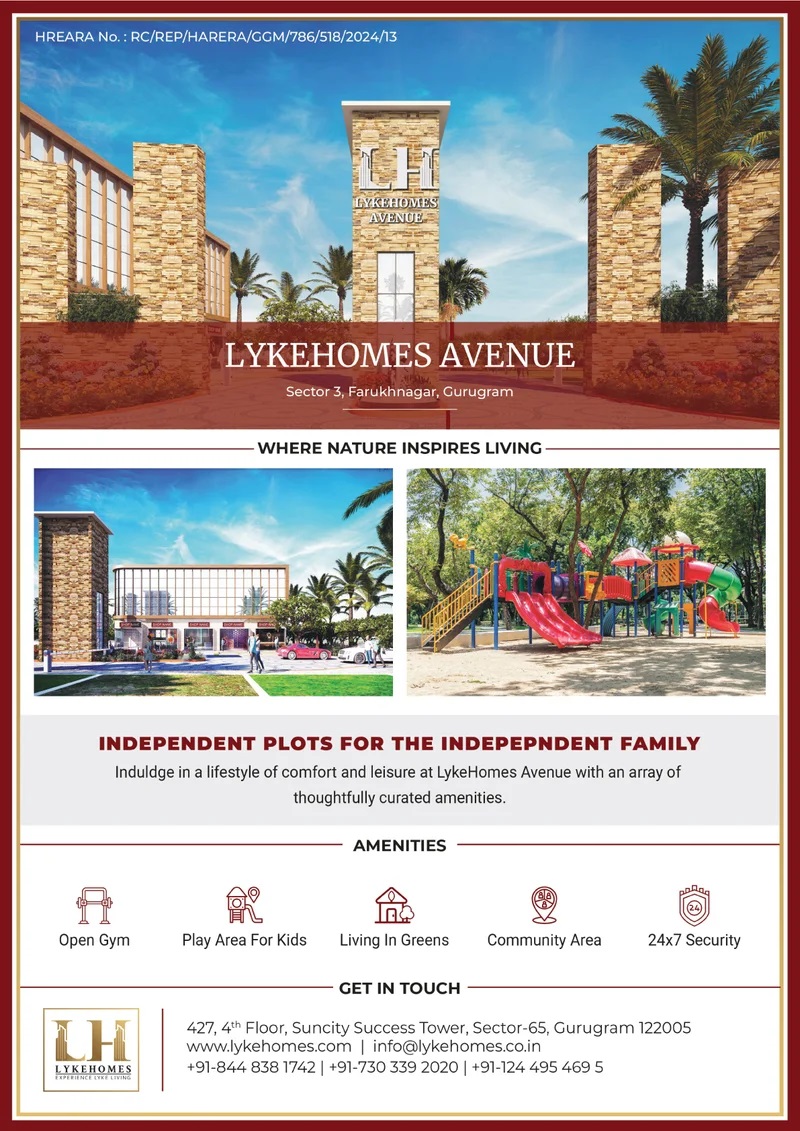 Welcome to LykeHomes Avenue, a premier DDJAY residential plotted housing project located in the heart of Sector 3, Farukhnagar, Gurugram. Immerse yourself in the harmonious blend of nature and modern living as you embark on a journey to build your dream home within this serene enclave. Our meticulously planned project offers affordable housing solutions, ensuring that your vision of a tranquil lifestyle becomes a reality. With sprawling green spaces, inviting walking trails, and vibrant community spots, LykeHomes Avenue promises a life of peace and harmony. Elevate your living experience in Sector 3, Farukhnagar, Gurugram, where nature inspires every aspect of your new home. Welcome to a haven of tranquility at LykeHomes Avenue.